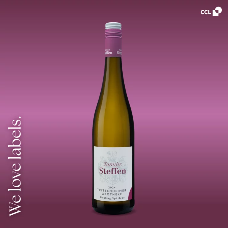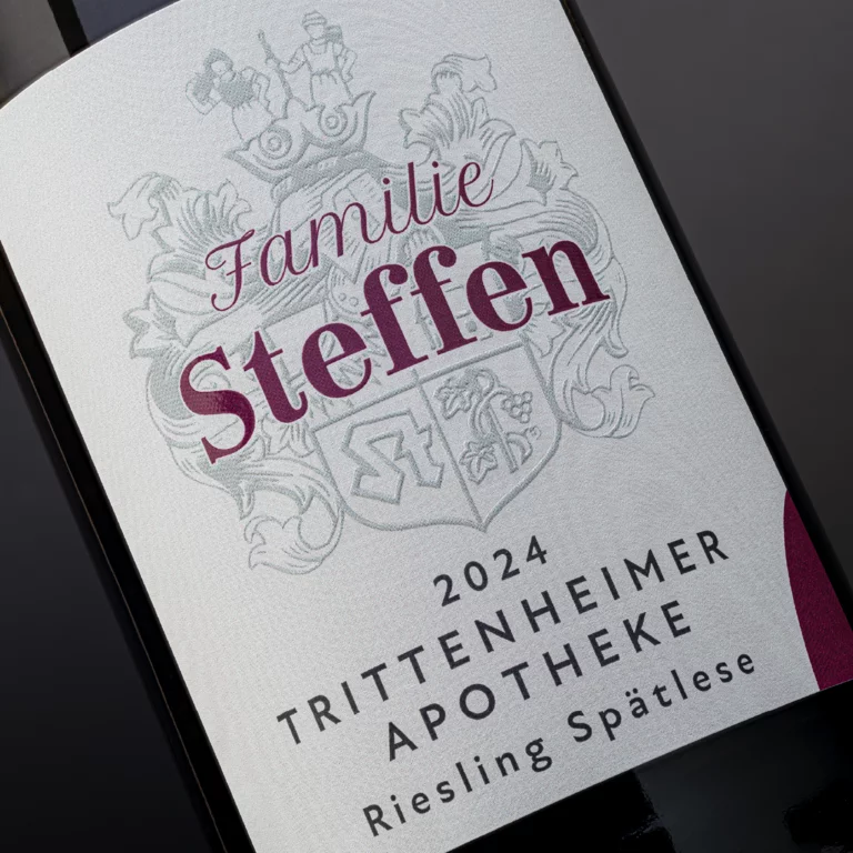 Der dunkelrote Schriftzug der Familie Steffen steht durch den Siebdruck-Glanzlack zwar im Vordergrund. Doch der eigentliche Star auf diesem Etikett ist das Familienwappen. Die Blindprägung des Wappens sorgt dafür, dass dieses dezent heraussticht, quasi spürbar wird. Und obwohl das Wappen nur im Hintergrund zu sehen ist, ist es ein Detail, das die lange Tradition und die Werte des Hauses stolz zeigt.